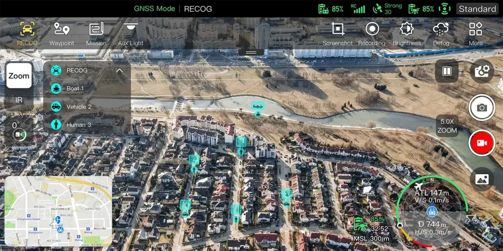 広角レンズや赤外線レンズをインテリジェントな AI アルゴリズムと自己学習システムと組み合わせて使用することで、航空機は人、車、ボートなどを自動的に認識して位置を特定し、それらの位置を地図上に投影することができます。