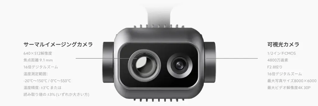 デュアルジンバルを搭載した広角可視光カメラは、鮮明な高解像度画像で広い視野を提供し、赤外線サーマルイメージングカメラは高解像度のサーマルイメージングアルゴリズムを統合し、明確で詳細な熱源識別を提供します。