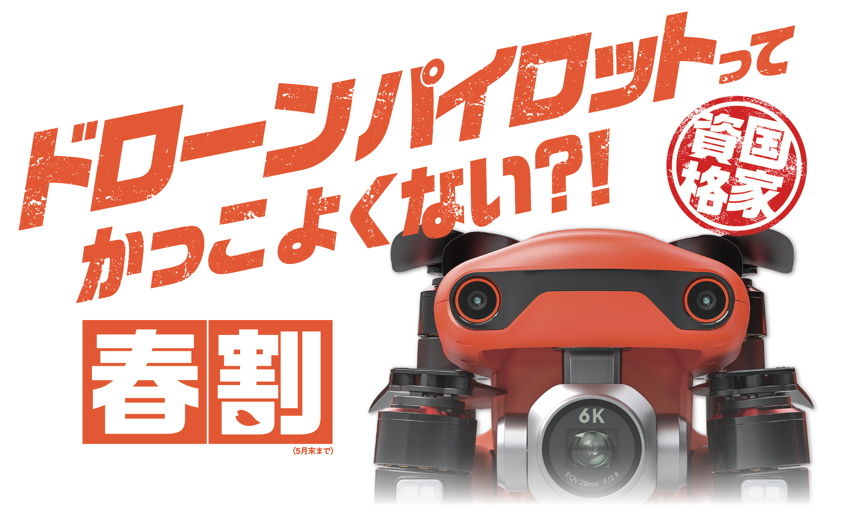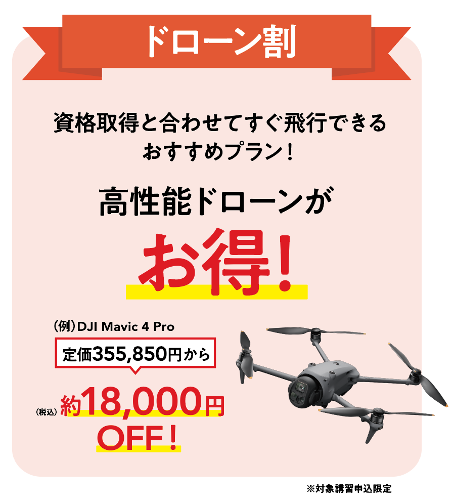 | 内容 | 無人航空機の資格取得と同時に、憧れのDJIドローンを手に入れたい方へ。 今なら、DJIドローンが5%OFFで購入できる特別プランをご用意! |